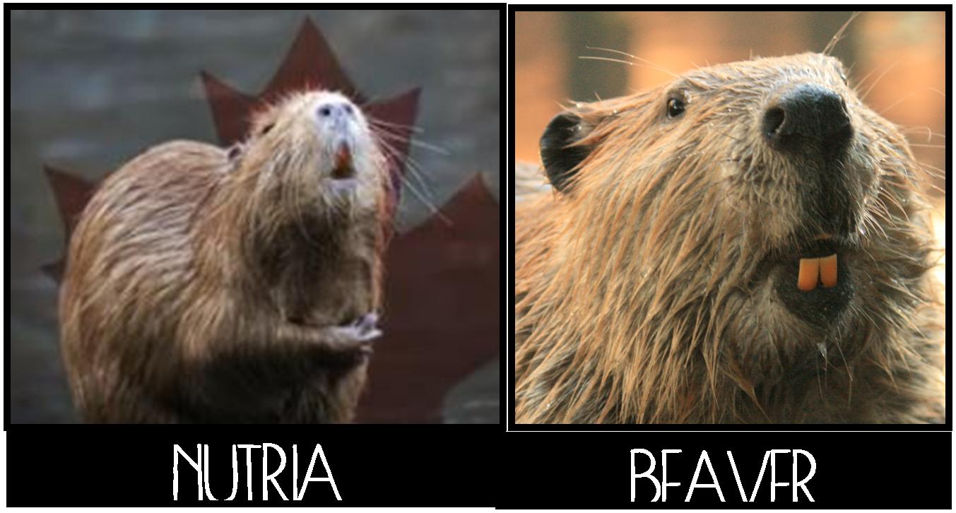 Even though they might live in the same neighborhoods and appear to do similar things the two species are every bit as distinct as Al and Adolf. These mistakes could be easily avoided. With only a little effort it can be seen that Nutria are quickly recognized in photos by their very prominent white whiskers and skinny rat-like tails. They also have gaping exposed nostrils with very little nose per se.