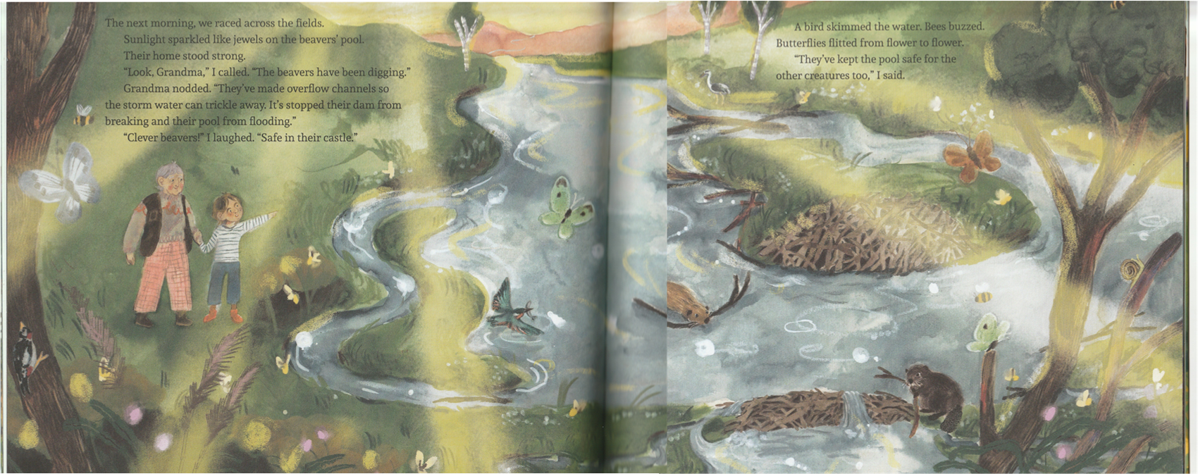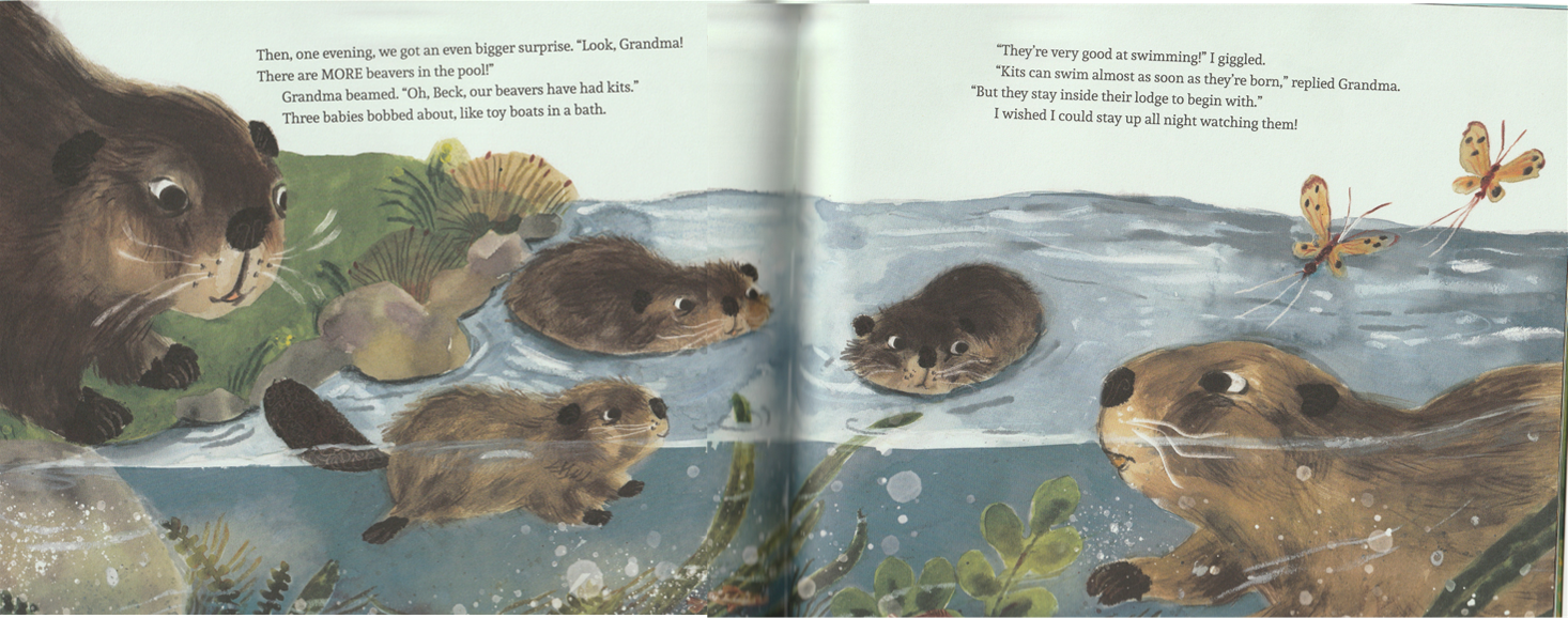 I recently came across this book published last year in Scotland, part of the Kelpies children series. Written by Catherine Ward and illustrated by Phoebe Roze. I have fall in love with these dreamy floaty images. Since I tend to keep an eye out for beaver illustrations I was surprised it escaped my attention, but when I shared it on the Beaver Facebook Forum it created such a splash I realized no one there had seen it either.