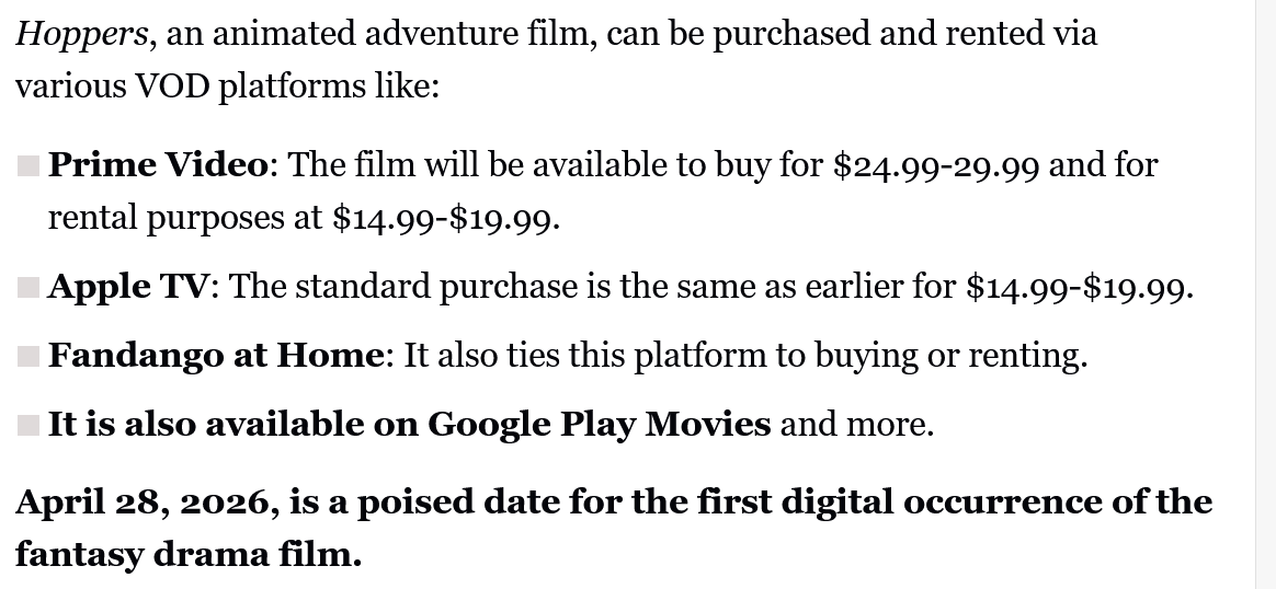 Pixar’s animated comedy “Hoppers” is coming to digital streaming this week. Walt Disney Studios Home Entertainment announced on Thursday (via When to Stream) that Hoppers will be released on digital streaming via premium video on demand on Tuesday, April 28. The film will be available for purchase on such digital platforms as Apple TV, Fandango at Home, Prime Video and YouTube Movies & TV for $29.99.