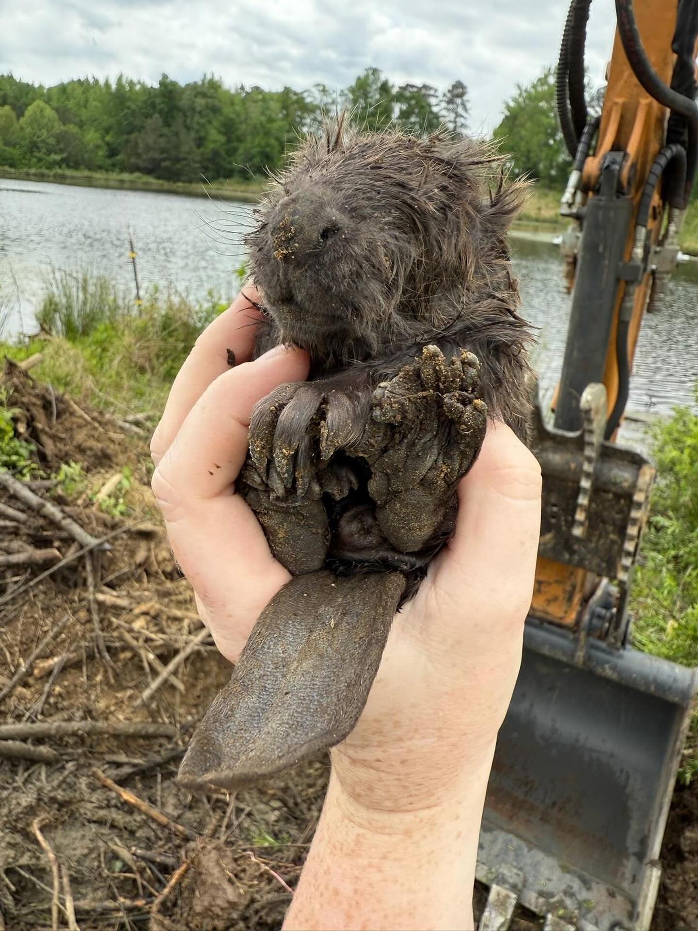 The machinery was cut off and the baby was placed in a cardboard box next to the water. After just an hour, the crew returned to check on the baby beaver and there was a clear track where the momma beaver came up the bank, smashed the cardboard box down and retrieved the baby. The work was stopped and the remaining lodge was left alone.